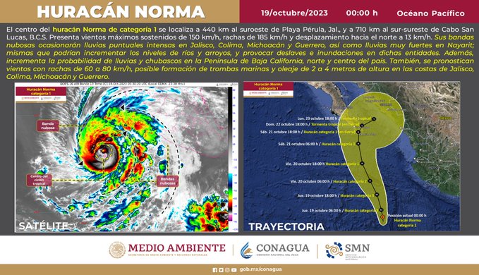 El huracán Norma, hasta esta emisión, de categoría 1, se acerca a México. Se espera que toque tierra hacia el fin de semana mientras tanto provoca lluvias intensas y vientos fuertes en el occidente, centro y sur del país. Las bandas nubosas de Norma interactuarán con un canal de baja presión, lo que provocará lluvias puntuales intensas en Jalisco y