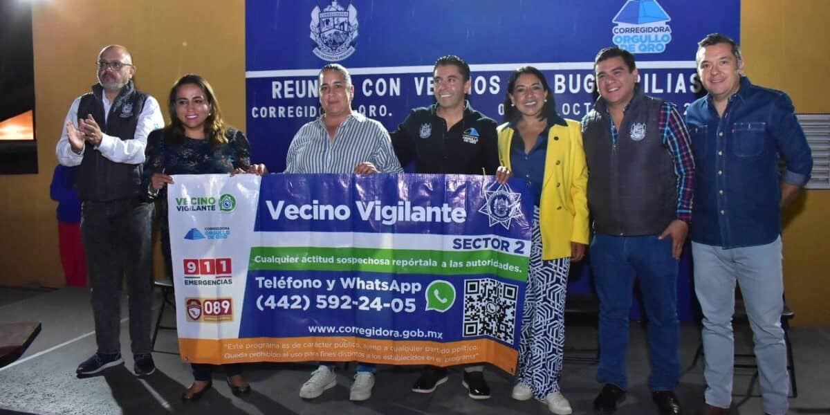 Roberto Sosa Pichardo, presidente municipal de Corregidora, se reunió con habitantes del condómino Bugambilias, del Fraccionamiento Camino Real, durante una asamblea realizada como parte de los trabajos del programa Vecino Vigilante, que implementa la Secretaría de Seguridad Pública Municipal, además de llevar a cabo acciones de reforestación en el lugar. Acompañado por integrantes de su equipo de trabajo y legisladores