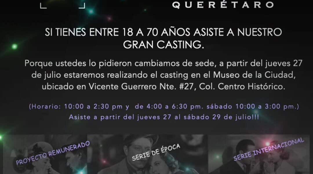 La oportunidad de ser actor que tanto habías esperado ha llegado, la empresa Eterno Casting busca actores extras para una série que filmará en nuestro estado. El Casting inició desde el pasado lunes 24 de Julio y concluirá el sábado 29 de Julio, aún que a partir de mañana jueves 27 de julio, cambiará de sede al Museo de la