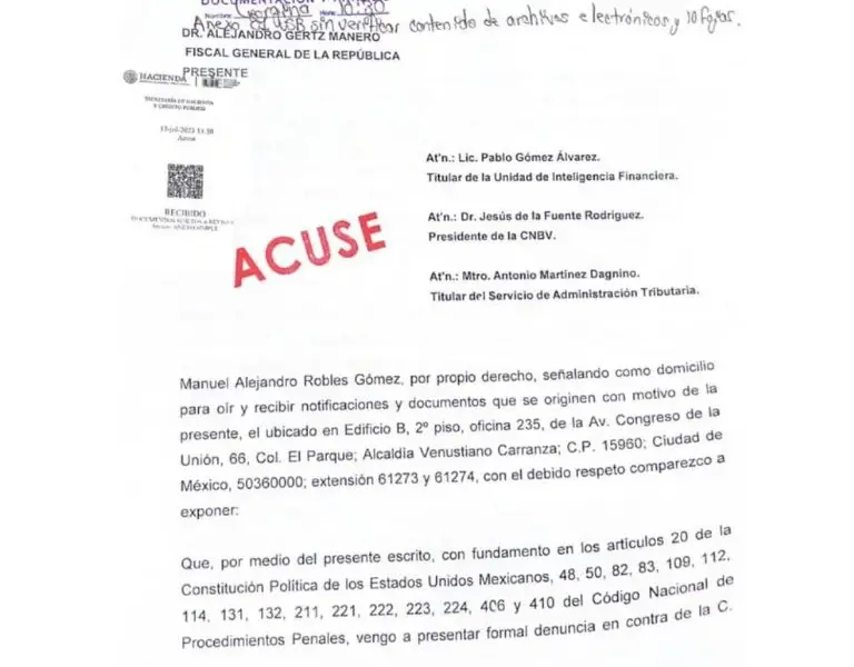 El diputado federal de Morena, Alejandro Robles, presentó una denuncia penal ante la Fiscalía General de la República (FGR) en contra de la aspirante a la candidatura presidencial de la oposición Xóchitl Gálvez por los delitos de enriquecimiento ilícito y lavado de dinero. Las denuncias, que también se hicieron extensivas a la Unidad de Inteligencia Financiera (UIF), son para que se investigue a