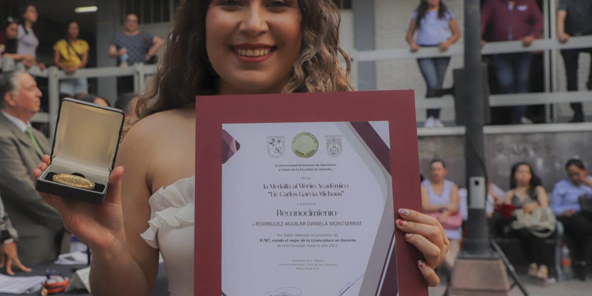 La Facultad de Derecho (FD) de la Universidad Autónoma de Querétaro (UAQ) otorgó la Medalla al Mérito Académico “Lic. Carlos García Michaus” a tres estudiantes de la Licenciatura en Criminología, Ciencias de la Seguridad y Derecho, respectivamente. Los galardonados de las medallas fueron: de la Licenciatura en Criminología, Estefanía Rodríguez Aguilar con promedio de 9.71; de la Licenciatura en Ciencias
