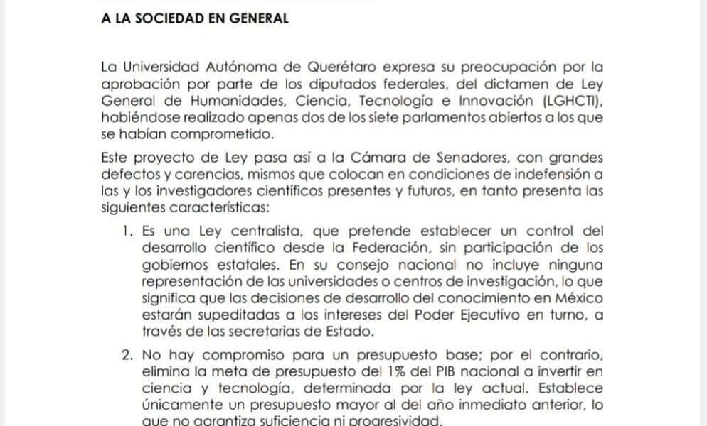 A través de un comunicado de prensa, la UAQ expresa su preocupación por la aprobación, por parte de los diputados federales del dictamen de la Ley General de Humanidades, Ciencia, Tecnología e Innovación. De acuerdo con la rectora de la UAQ, Teresa García Gasca, únicamente se realizaron dos de los siete parlamentos abiertos a los que se comprometieron, pasándola a