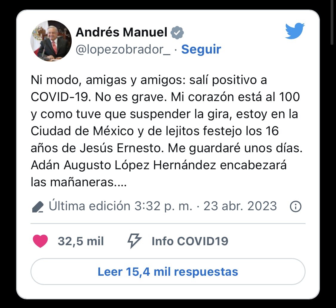 “Ni modo, amigas y amigos: salí positivo a covid-19. No es grave. Mi corazón está al 100 y como tuve que suspender la gira, estoy en la Ciudad de México y de lejitos festejo los 16 años de Jesús Ernesto. Me guardaré unos días. Adán Augusto López encabezará las mañaneras. Nos vemos pronto”, escribió.