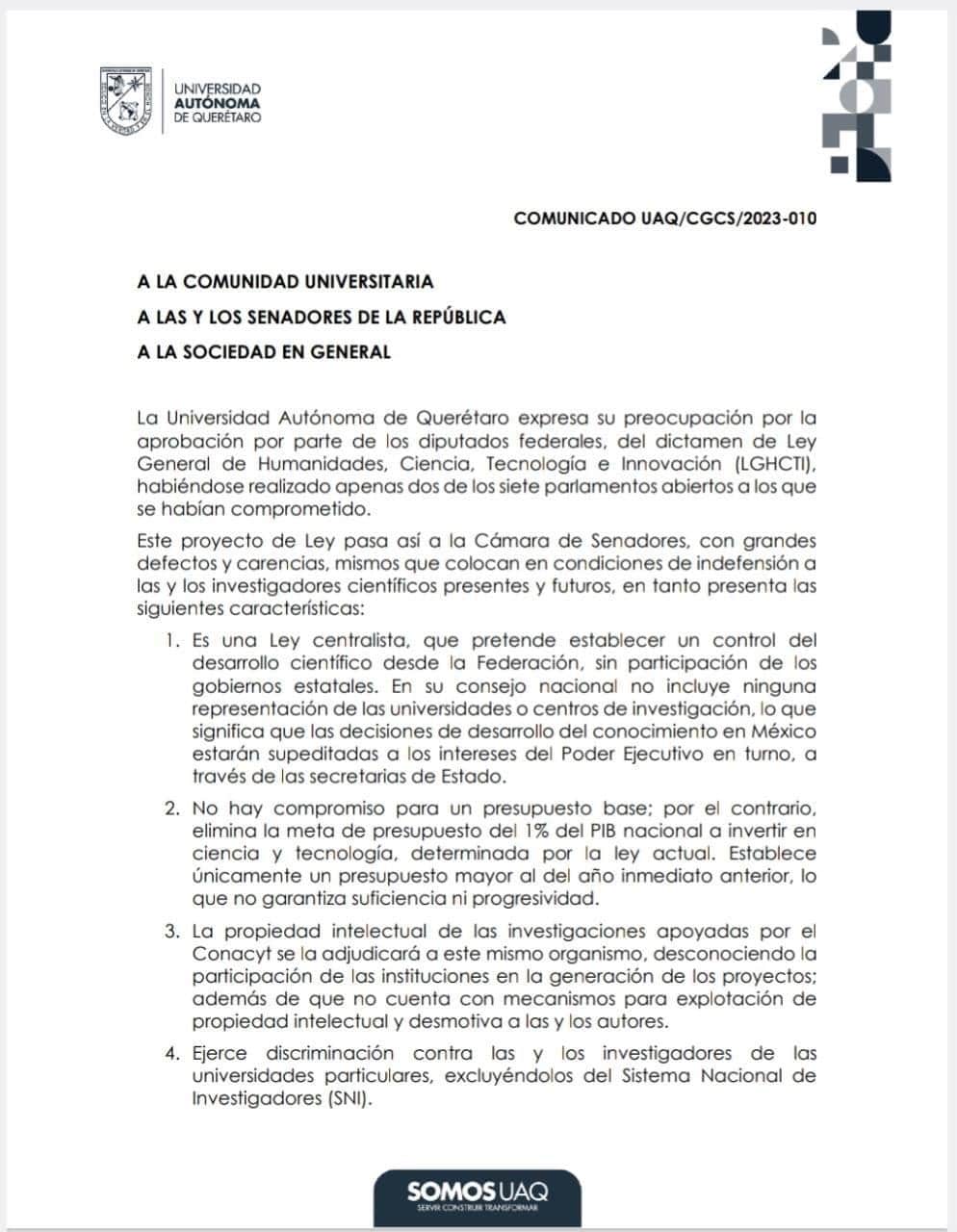 A través de un comunicado de prensa, la UAQ expresa su preocupación por la aprobación, por parte de los diputados federales del dictamen de la Ley General de Humanidades, Ciencia, Tecnología e Innovación.