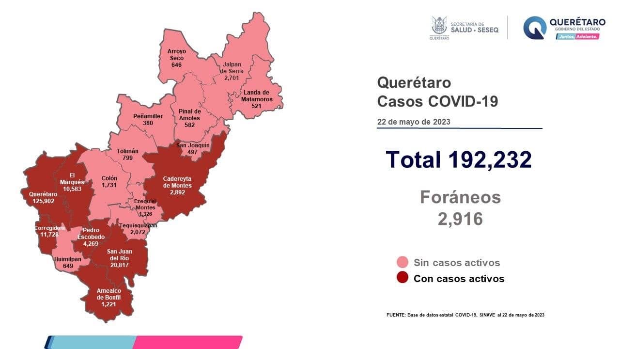 La Secretaría de Salud de Querétaro reportó este lunes cero defunciones por COVID-19 y se reportó que en los últimos siete días se han sumado 277 casos de la enfermedad en el estado se trata de 165 mujeres y 112 hombres. El registro acumulado es de 192 mil 232 casos; 54% son mujeres y 46% son hombres.