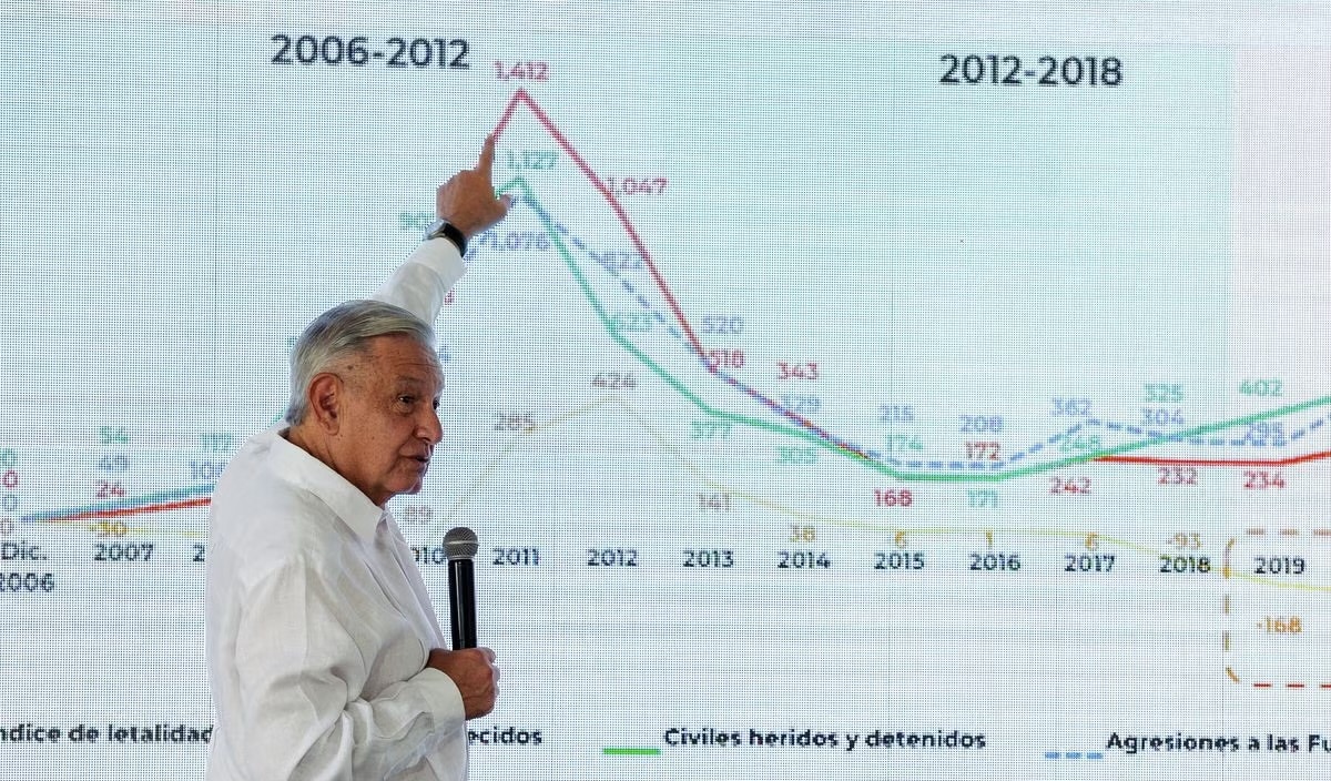 Su planilla señala que entre 2019 y el último registro oficial que hay este año, se reportaron 151.471 homicidios. A esos faltan agregar los que ocurrieron en las últimas semanas. Entre 2013 y 2018, un periodo en el que mayoritariamente gobernó Peña Nieto, hubo 157.158 asesinatos. Y en los años de Calderón, entre 2007 y 2012, se registraron 121.613.
