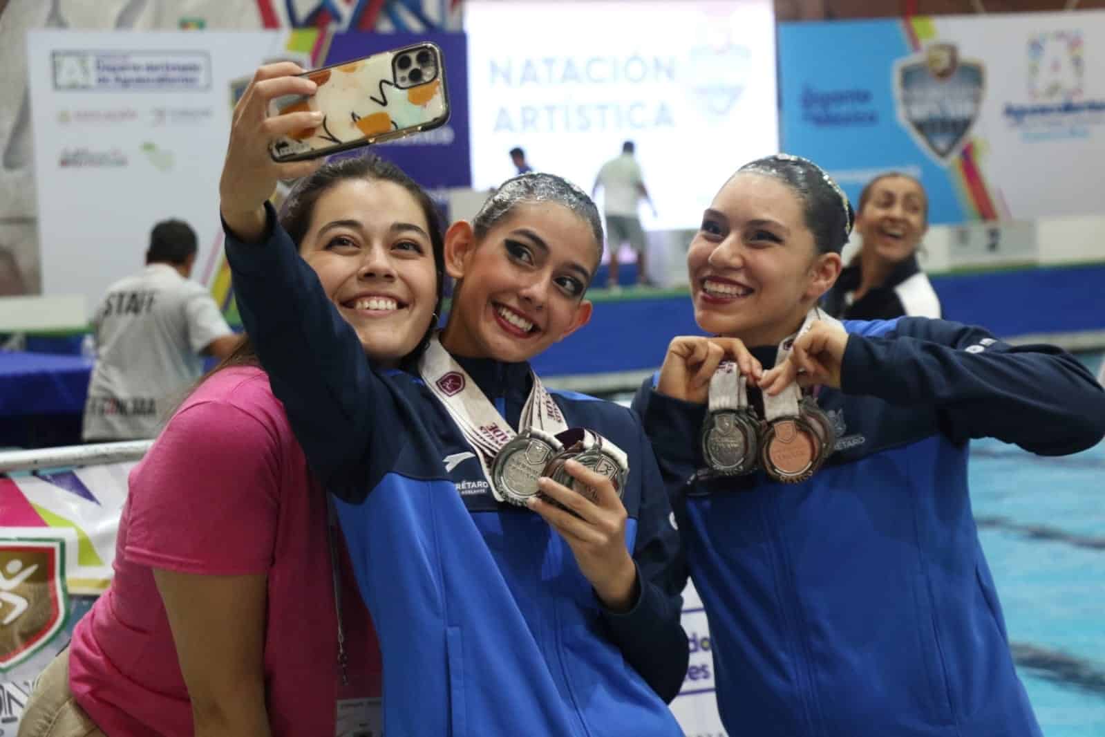 La natación artística es la disciplina que combina natación, gimnasia y danza. El cuadro queretano recibió un reconocimiento por lograr el tercer sitio general de la competencia, tras el Estado de México, que conquistó el primer lugar, y Jalisco con el segundo puesto.