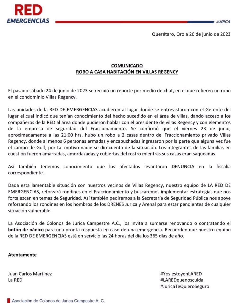 La Asociación de Colonos de Jurica Campestre A.C. Dió a conocer a través de un comunicado a sus habitantes, de dos violentos robos a casa habitación en el Fraccionamiento Villas Regency, ubicado en Jurica Campestre.