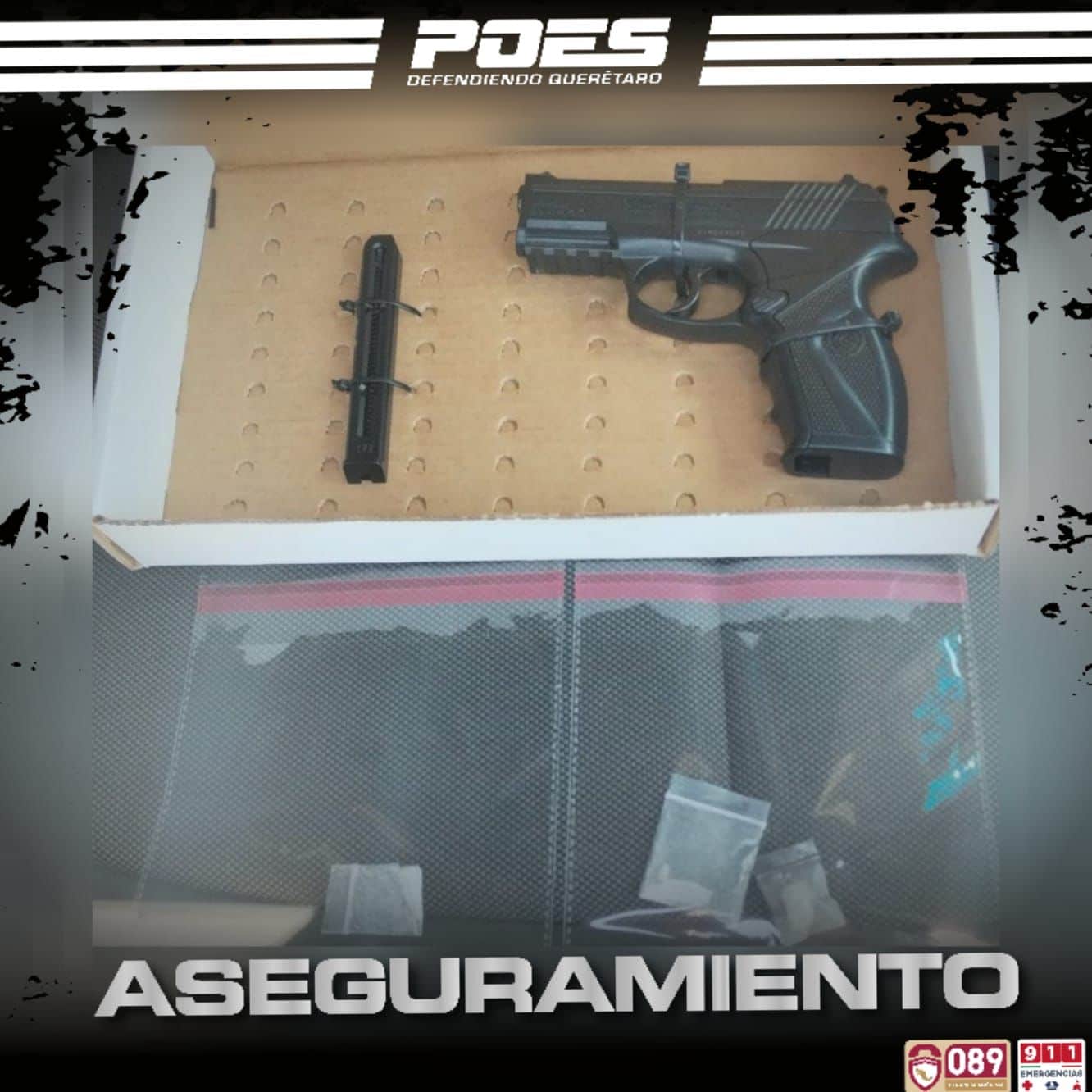 Fue en el Parque Industrial Bernardo Quintana que se efectuó una inspección a una empresa de seguridad privada que presta servicio en uno de los espacios de dicho inmueble, localizándole a uno de los guardias un arma sin registro además de dosis de narcótico, por lo que el hombre se puso a disposición de la autoridad competente.