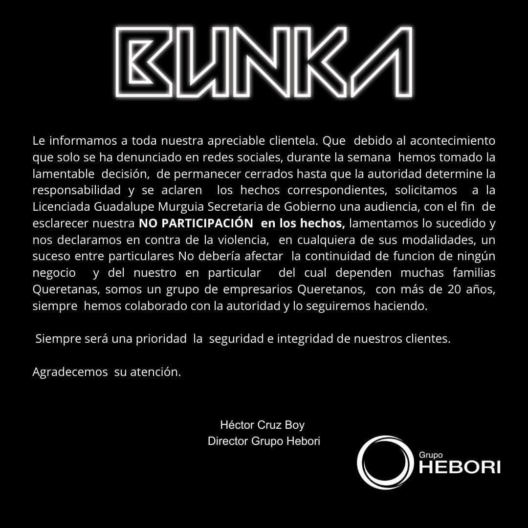 En dicho comunicado, Bunka bar anunció el cierre temporal del establecimiento hasta en tanto la autoridad determine responsabilidades tras los hechos de violencia ocurridos al exterior del negocio.