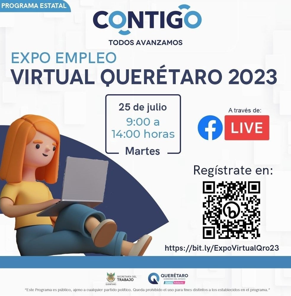 Quienes deseen participar podrán hacerlo de 9:00 a 13:00 horas vía FB Live en la página de la Secretaría del Trabajo Querétaro, y podrán realizar su registro en https://bit.ly/ExpoVirtualQro23.