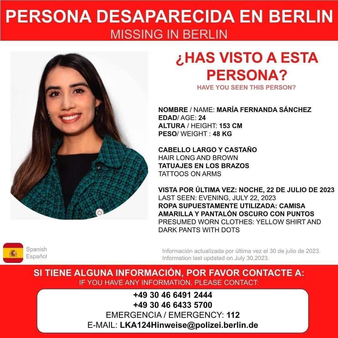 La familia de la joven María Fernanda Sánchez, desaparecida en Berlín, Alemania, ya solicitó más apoyo económico para su estancia en ese país.