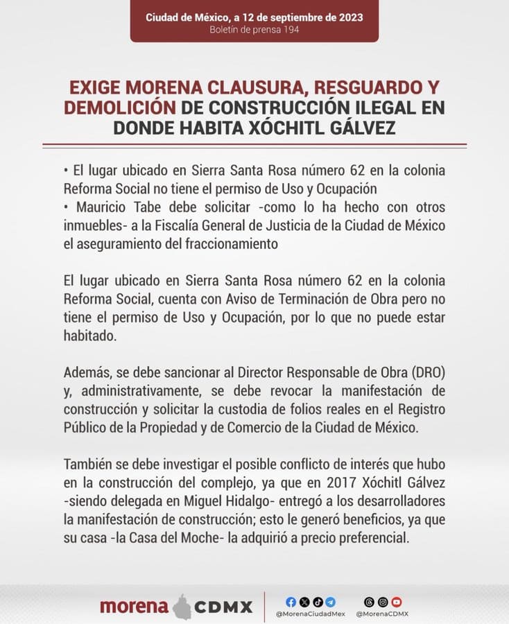 Morena en la Ciudad de México exigió al alcalde de Miguel Hidalgo, Mauricio Tabe, la clausura, resguardo y demolición del conjunto habitacional en el que vive Xóchitl Gálvez, senadora del PAN y candidata a la presidencia del Frente Amplio por México.
