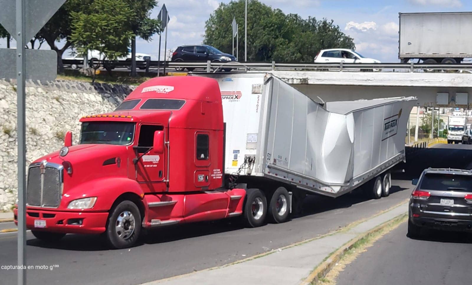 El operador tomó la desincorporación de la carretera México – Querétaro a Quintas del Marqués, para después intentar incorporarse a Luis Vega y Monroy, pero no consideró la altura y terminó por atorarse y partir su caja seca que transportaba a la mitad.