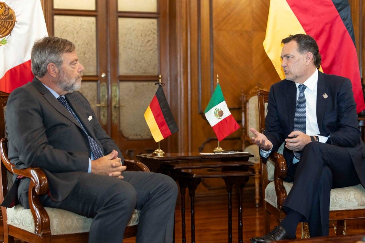 Durante una visita de cortesía y reunión de trabajo realizada en Palacio de Gobierno, el titular del Poder Ejecutivo, dialogó con el diplomático europeo sobre la apuesta de su gobierno por un desarrollo económico emanado de energías limpias y sustentables, con movilidad, seguridad, agua y energía. En la reunión, quedó plasmado que Alemania es el segundo socio comercial del estado queretano, dado que para el primer trimestre del 2023 en Querétaro se registra una inversión alemana de 68.7 millones de dólares.