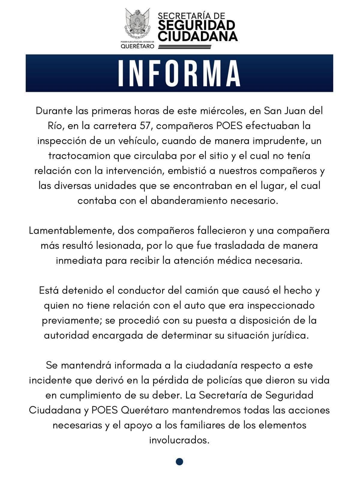 Se mantendrá informada a la ciudadanía respecto a este incidente que derivó en la pérdida de policías que dieron su vida en cumplimiento de su deber. La Secretaría de Seguridad Ciudadana y POES Querétaro mantendremos todas las acciones necesarias y el apoyo a los familiares de los elementos involucrados.