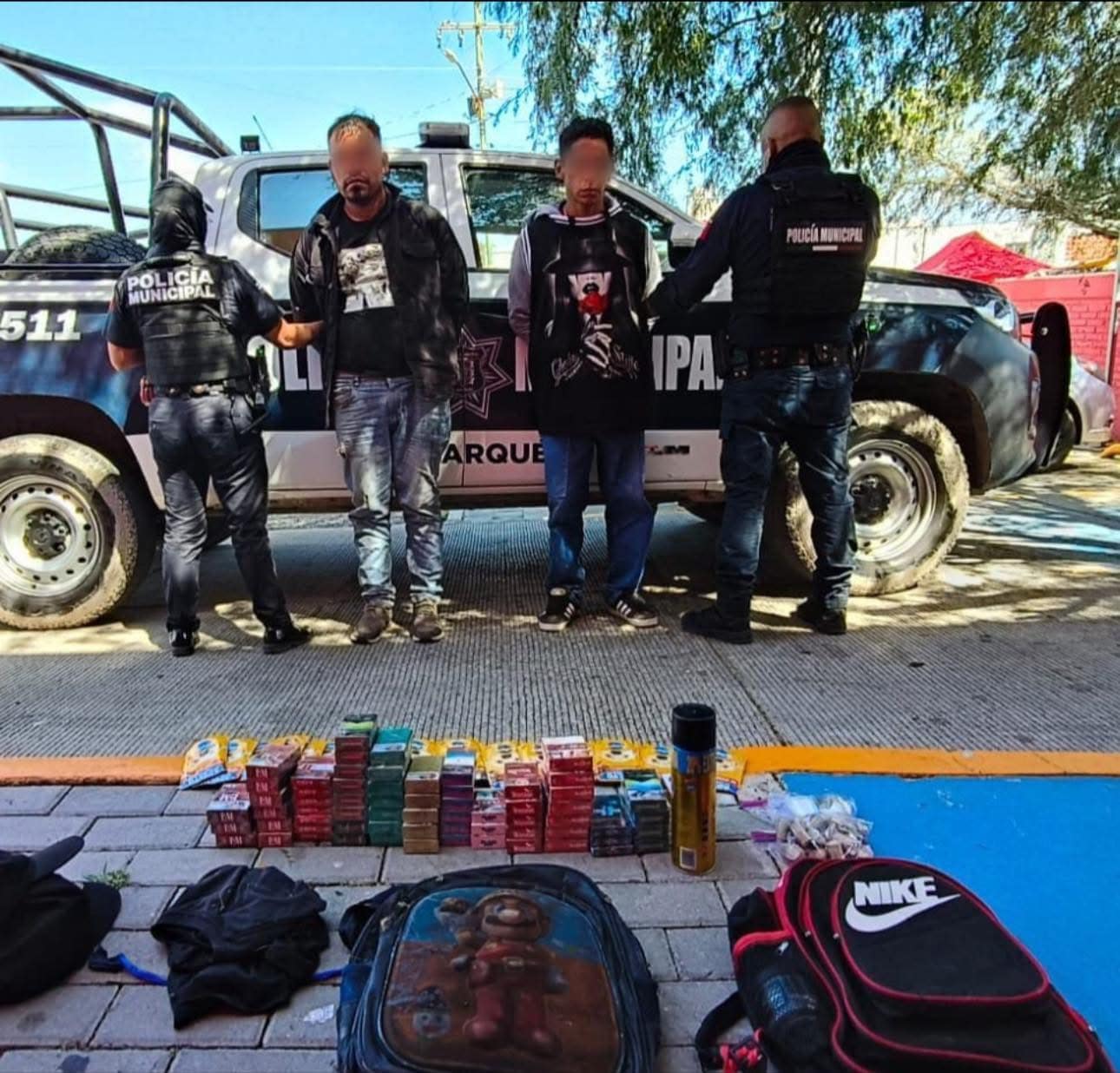 Con las características de los presuntos responsables, a través del sistema de videovigilancia y del patrullaje en la zona de forma inmediata se tuvo a la vista a los dos sujetos señalados, a quienes tras llevar a cabo una revisión a su persona, les fueron aseguradas dos mochilas que en su interior contenían diversos productos que minutos antes habían sustraído, por lo que de manera inmediata se les dio lectura a sus derechos y fueron puestos a disposición de la autoridad para determinar su situación jurídica.