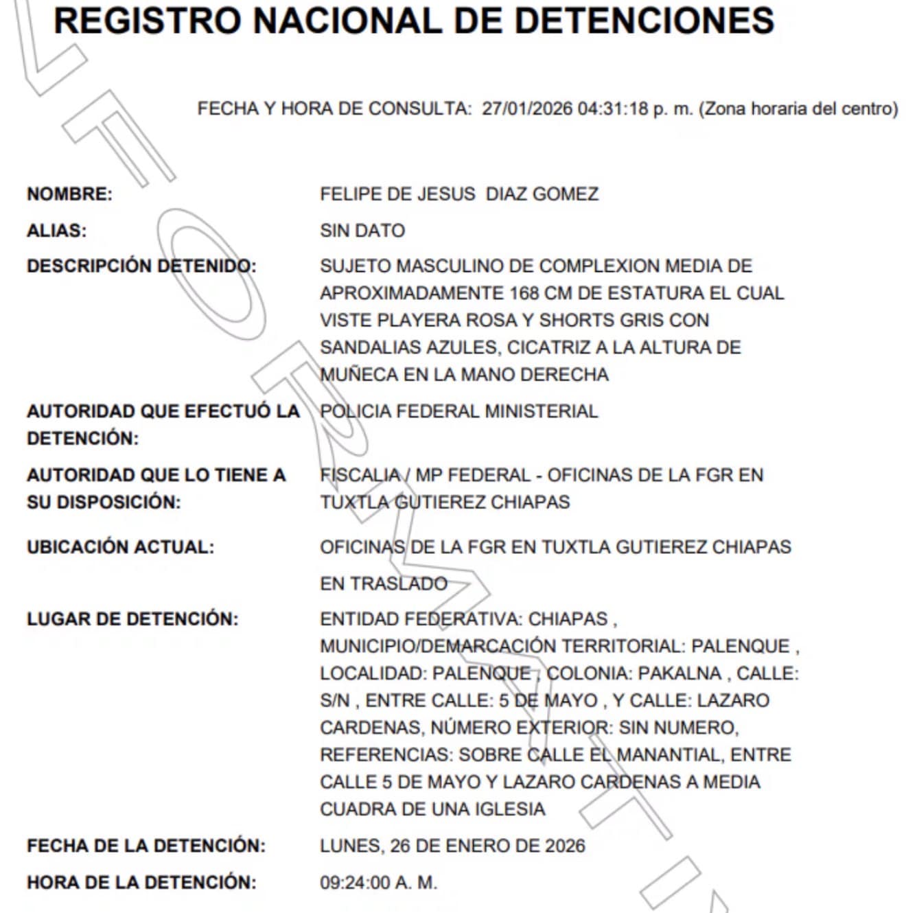 De acuerdo con el Registro Nacional de Detenciones, Felipe de Jesús Díaz Gómez fue detenido el lunes en Chiapas por la Policía Federal Ministerial y está identificado como el “maquinista principal” del tren accidentado.