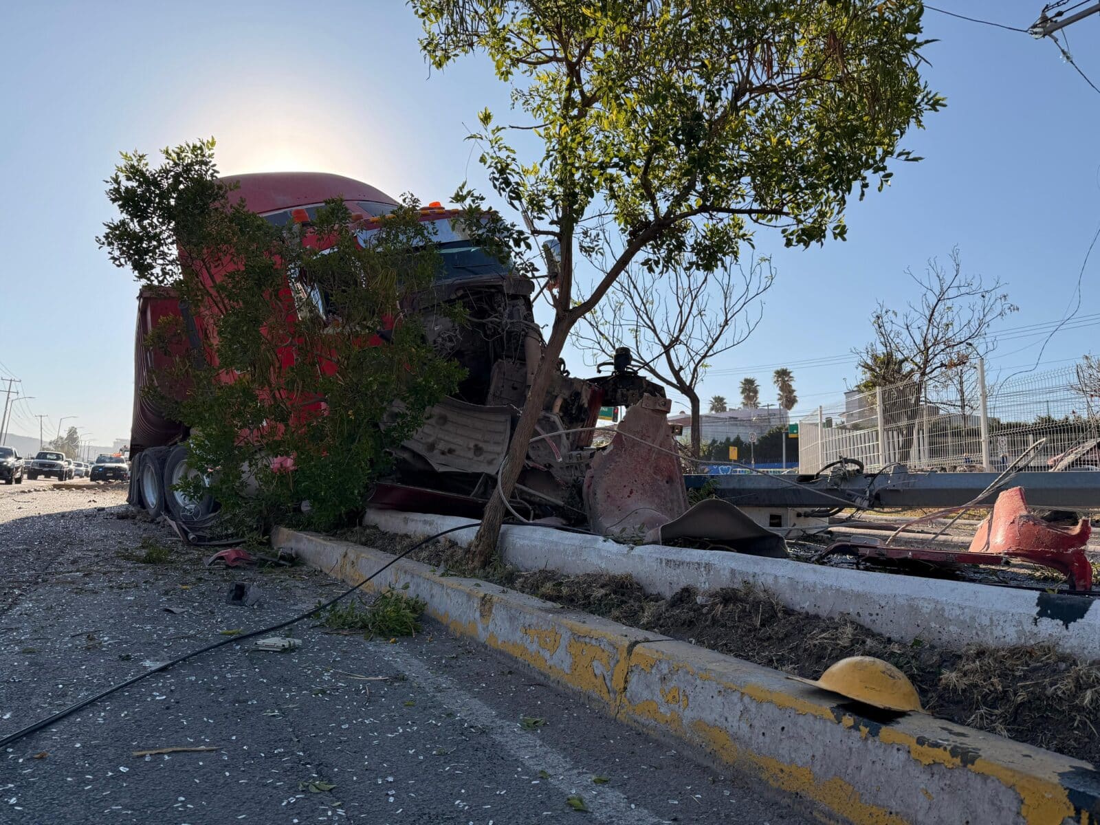 Se trató de un tráiler tipo tolva que circulaba en dirección a Pasteur, cuando se quedó sin frenos y el operador ya no pudo detener la pesada unidad, por lo que embistió a siete vehículos que esperaban el semáforo en verde y todo lo que estuvo a su paso, señalamientos, semáforo, árboles y un poste de cámaras de seguridad, quedando sobre el camellón central.