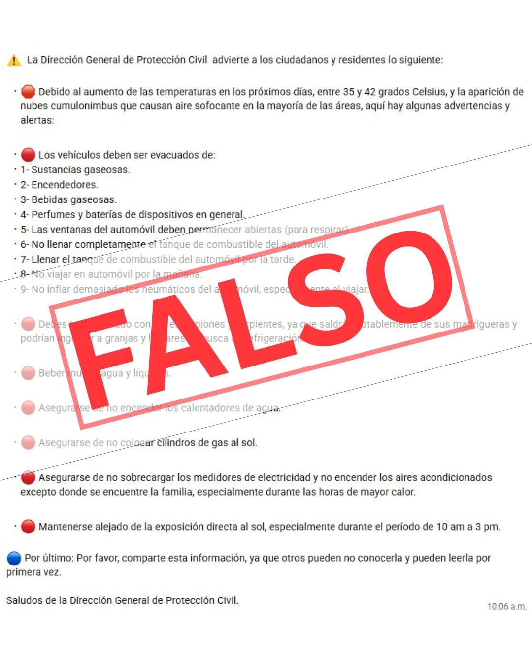 Aunque el contenido difundido es falso, Protección Civil recordó la importancia de seguir medidas preventivas ante altas temperaturas, como mantenerse hidratado, usar ropa ligera, evitar la exposición prolongada al sol y permanecer en espacios ventilados.